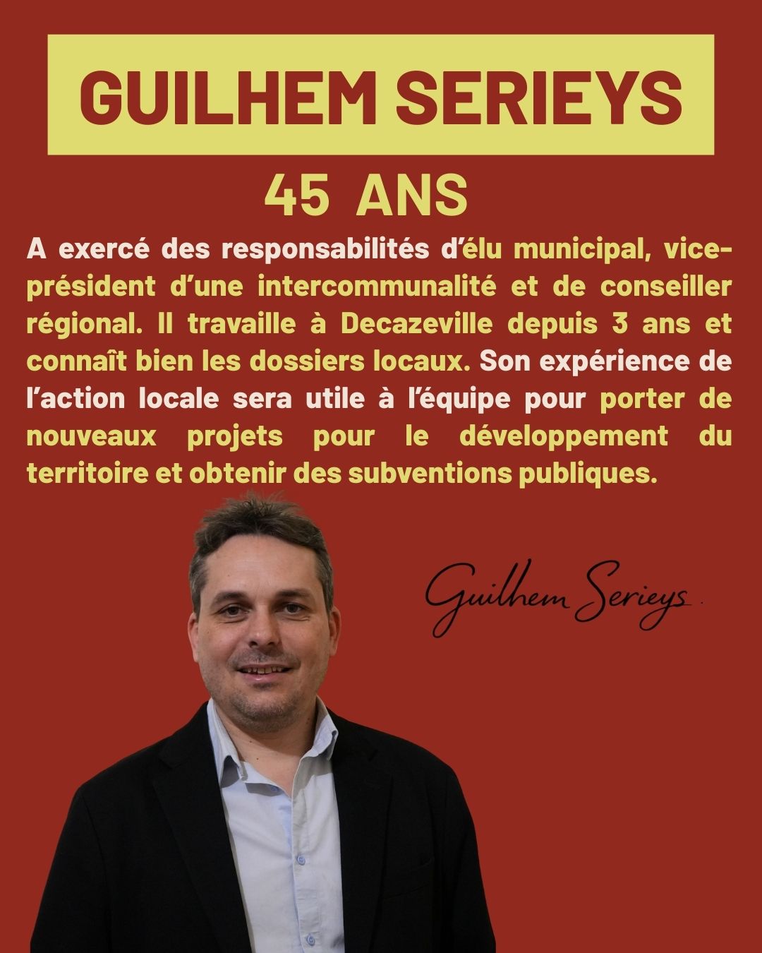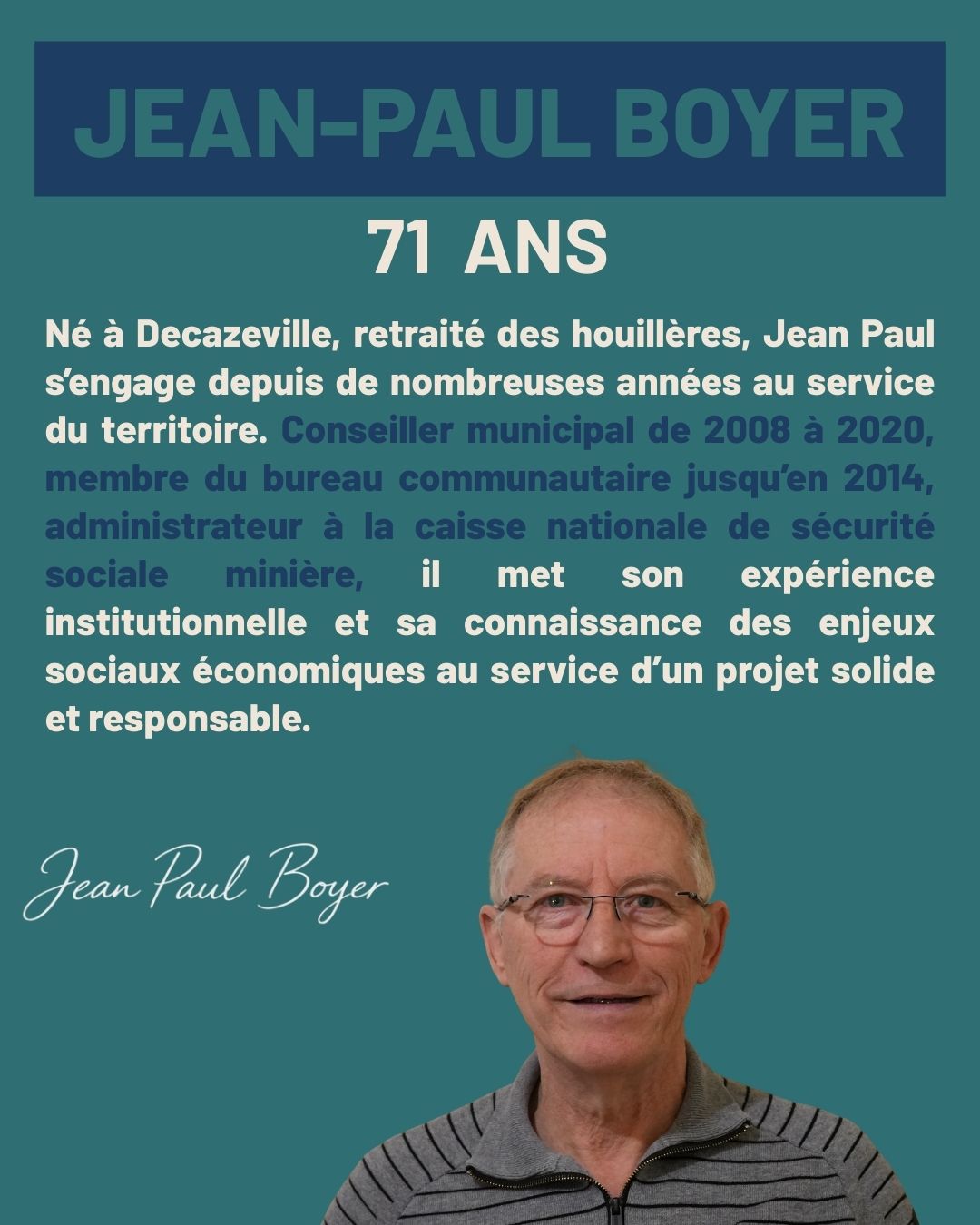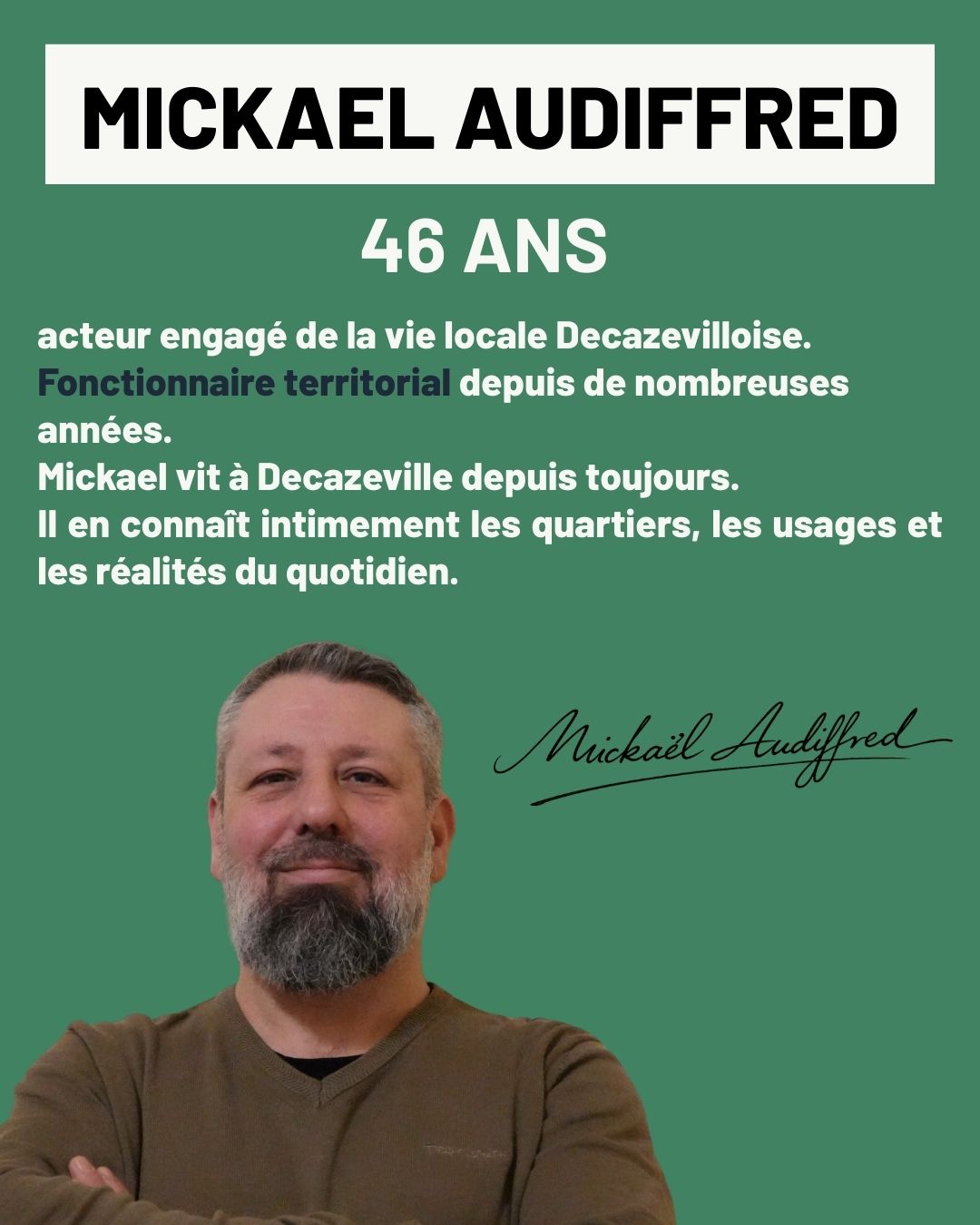 Si j’ai choisi de m’engager, c’est parce que je crois profondément que Decazeville mérite mieux que le renoncement ou l’habitude. Elle mérite un projet clair, construit avec méthode, et surtout avec celles et ceux qui y vivent.