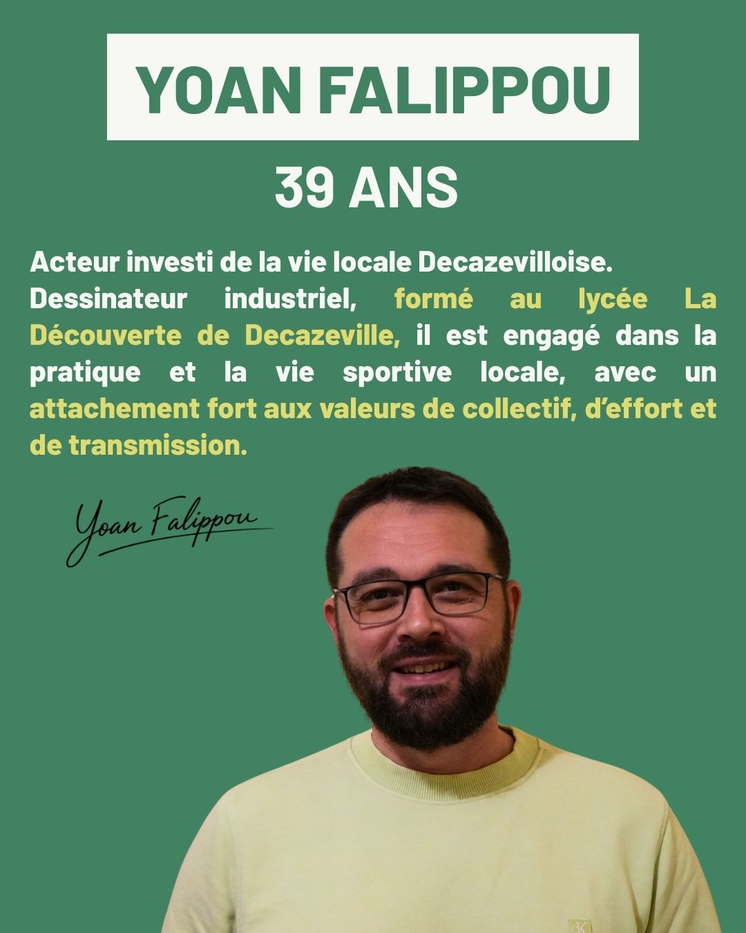 Je vis à Decazeville depuis 25 ans. J’y ai construit ma vie, ma famille, mon parcours professionnel. Comme beaucoup d’entre vous, j’ai vu notre ville traverser des périodes difficiles, mais je sais aussi combien elle possède de ressources, d’énergie et de talents.